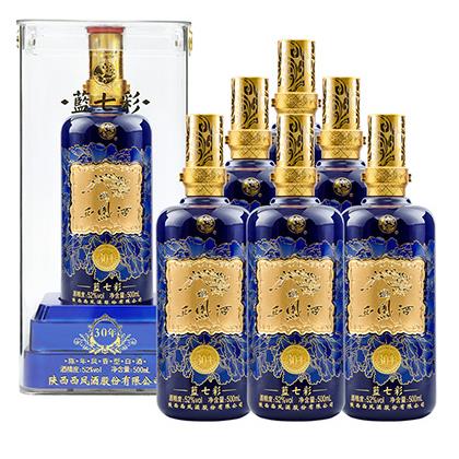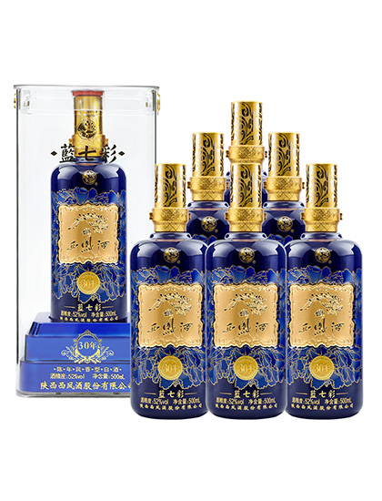 藍七彩30年,西鳳酒主導的重點大單品之一,是奠定次高端白酒市場的形象產(chǎn)品。高級質感透明亞克力材質外盒,瓶身呈現(xiàn)藍寶石般色澤,配以鎏金圖案紋理,天香牡丹金線勾邊花紋環(huán)繞,華貴典雅、寓意吉祥。瓶體設計挺拔通直,曲線圓弧有度。極具收藏觀賞性。采用30年酒海陳釀作為基酒勾調,厚重感陳年鳳香。